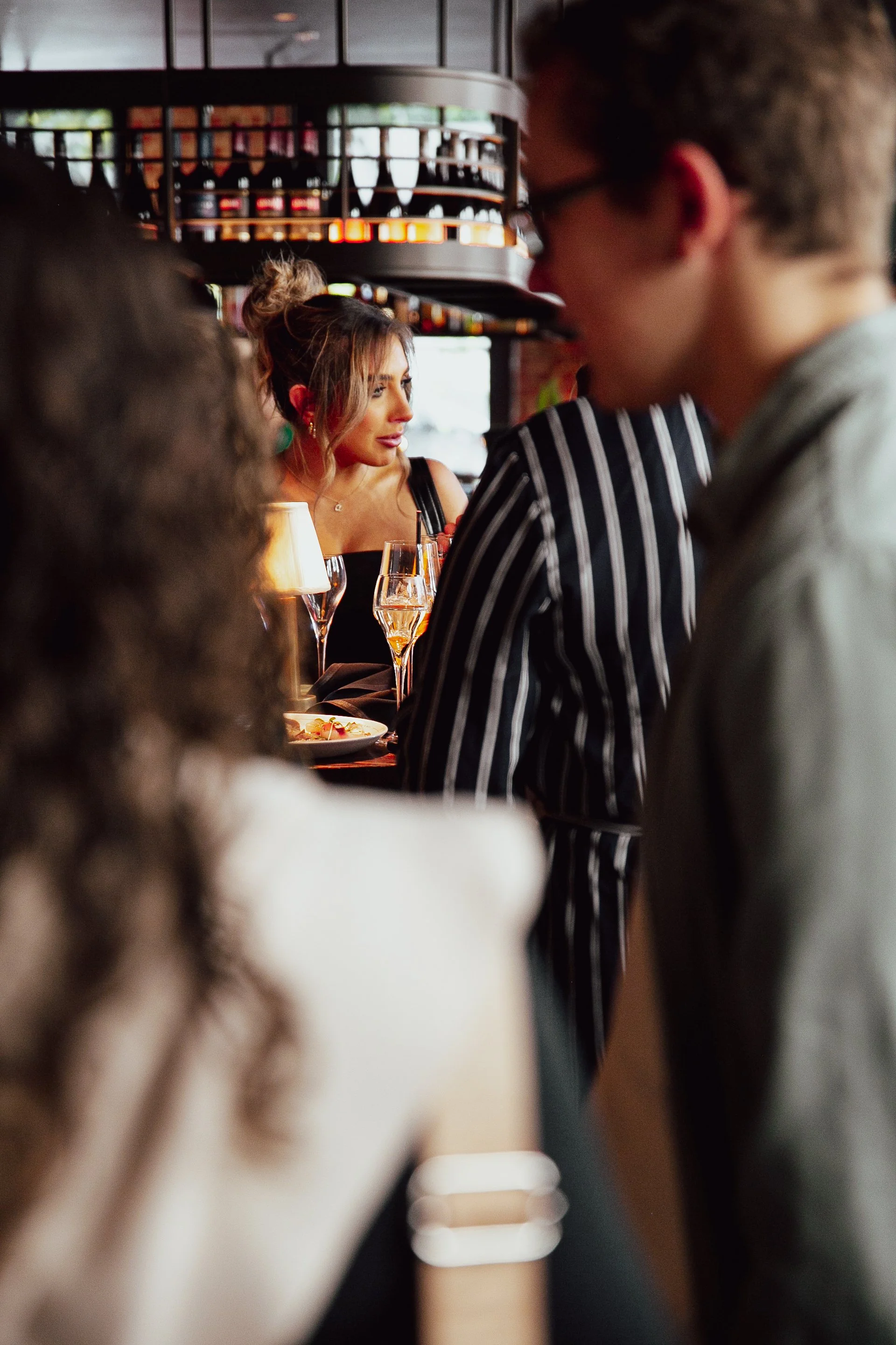 Stacked crystal champagne glasses at an event with blurred background of people and warm lighting.